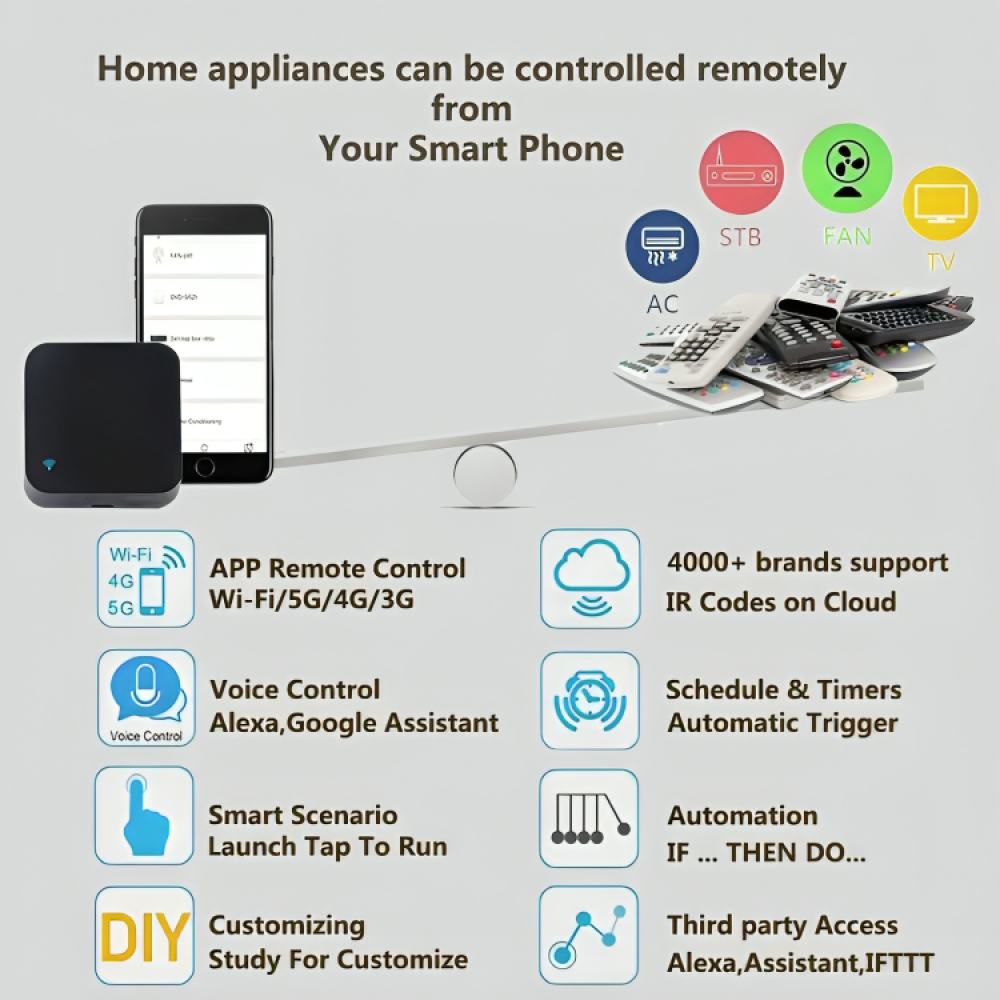 - راحة الاستخدام: يوفر لك هذا الجهاز الذكي تجربة مريحة للتحكم في أجهزتك المنزلية بنقرات بسيطة على هاتفك.